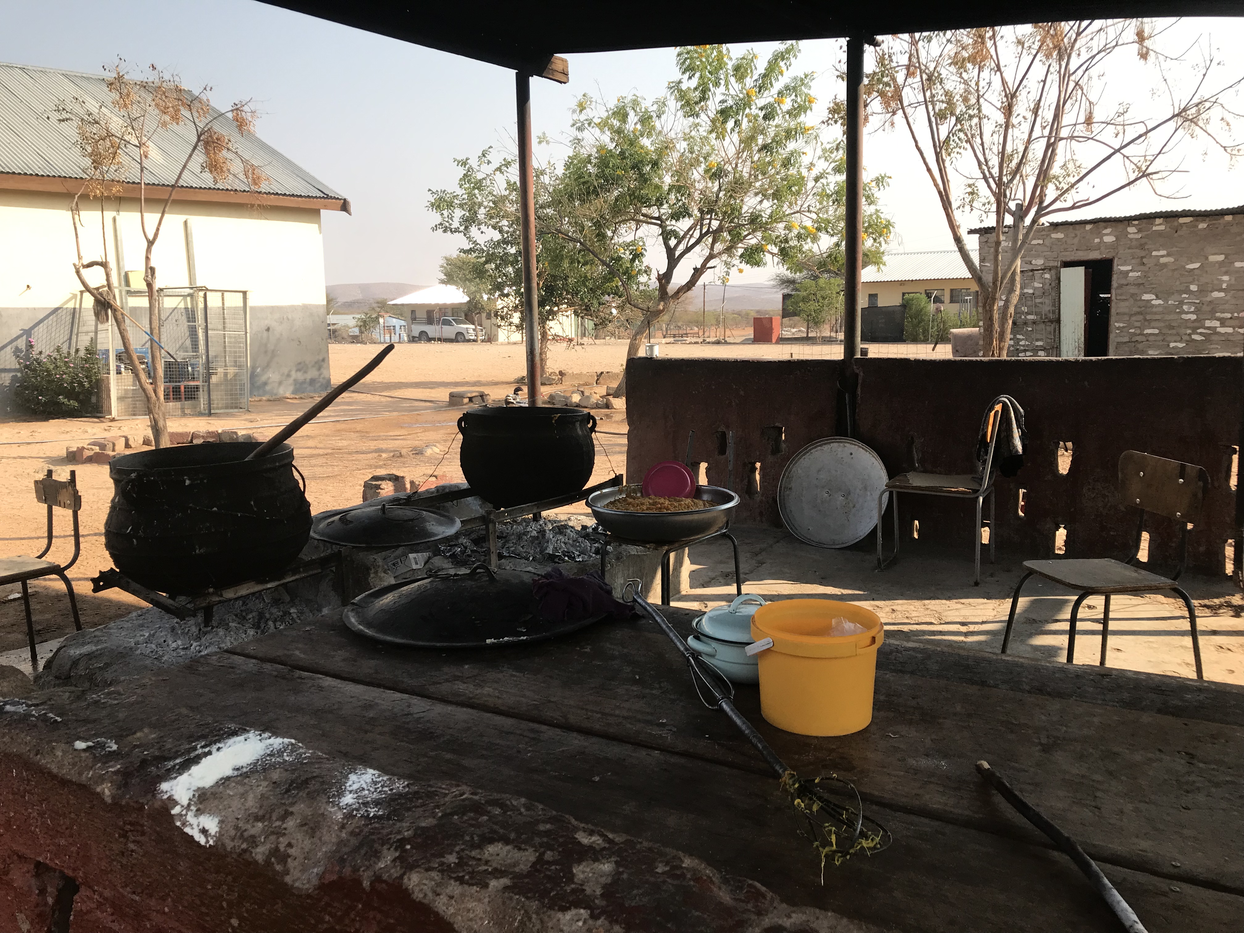 Um 8.30 treffen wir uns mit Deska, dem Guide, den Katrin letztes Jahr kennen gelernt hat. Mit zwei niederländischen Familien gehen wir eine Stunde durch die Steppe zu seiner Farm. Er hatte mal 70 Kühe, aber da es seit vier Jahren nicht mehr geregnet hat, sind es nur noch 10 Kühe und etliche Ziegen. Ursprünglich hat das Land mal einem weißen Farmer gehört, der als er ging, das Land Deskas Vater überlassen hat. Jetzt hat die Comunity der Gegend den Campingplatz als weitere Einnahme Quelle, was angesichts des Wetters sehr wichtig ist. Die Verwaltung etc. wirkt sozialistisch, da die Gewinne allen zugute kommen. Deska erzählt viel und dann sollen we ihm helfen sein Haus zu bauen. Ein traditionelles Haus Süd Stöcken und Lehm. Es ist sehr klein, aber es reicht zum Schlafen. Seine Mutter rührt für uns die richtige Mischung an, Eseldunk, Lehm und Erde vermischt mit Wasser. Dann geht es wie beim Brotbacken, sagt sie plötzlich auf deutsch und knetet die Erde. Danach sind wir dran und formen große Kugeln daraus, die wir dann zwischen die Stäbe des Hauses verteilen. Nach dem Händewaschen gibt es noch Krapfen, auf dem offenen Feuer zubereitet. Noch ein Blick in den Garten, in demKürbis, Mais und vieles mehr wächst.