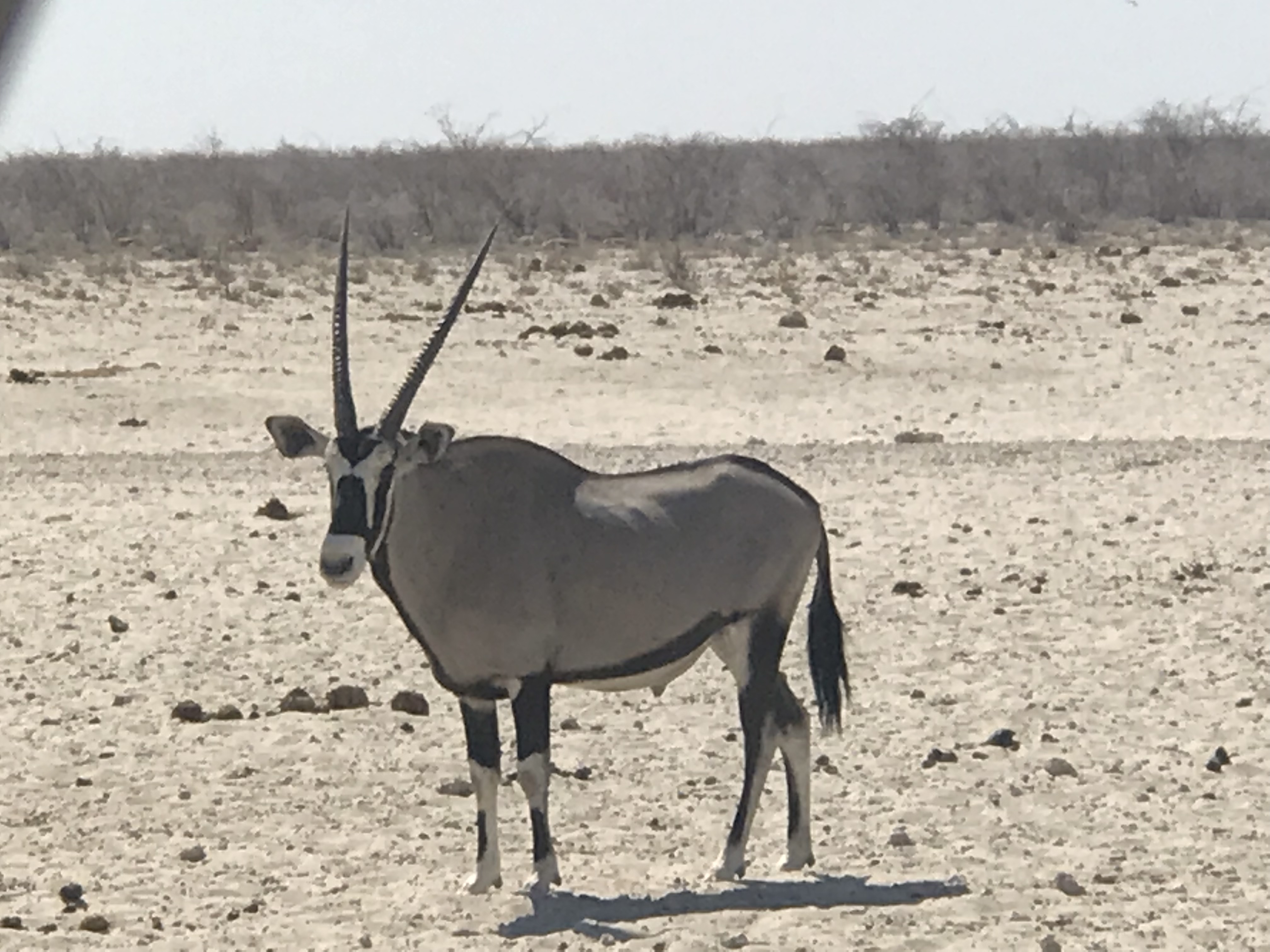 Dann geht es zum einzigen Wasserloch, das 11 km in die andere Richtung liegt, aber auf keinen Fall sollten wir weiter fahren, da würde sei Strecke zu schlecht, sagte die Frau am Eingang und auch nicht vom Weg abfahren. Also fuhren wir 11 km, 13 km, kein Wasserloch zu sehen und auch keine anderen Menschen, der Weg wurde immer sandiger, so dass ich irgendwann echt Panik hatte, wir könnten stecken bleiben und wären doch vom Weg abgekommen. Die Frau hatte mich so eindringlich davor gewarnt, nicht weiter zu fahren, dass ich Frank eindringlich bat umzukehren. Dumm von mir, denn den Weg, den wir danach ausprobiert haben, war noch schlimmer. Was wir daraus lernen: afrikanische Zeit und km Angaben sollte man nicht mit deutscher Pedanterie ernst nehmen. Aber eigentlich hatten wir auch ohne Wasserloch viele schöne Tiere gesehen.