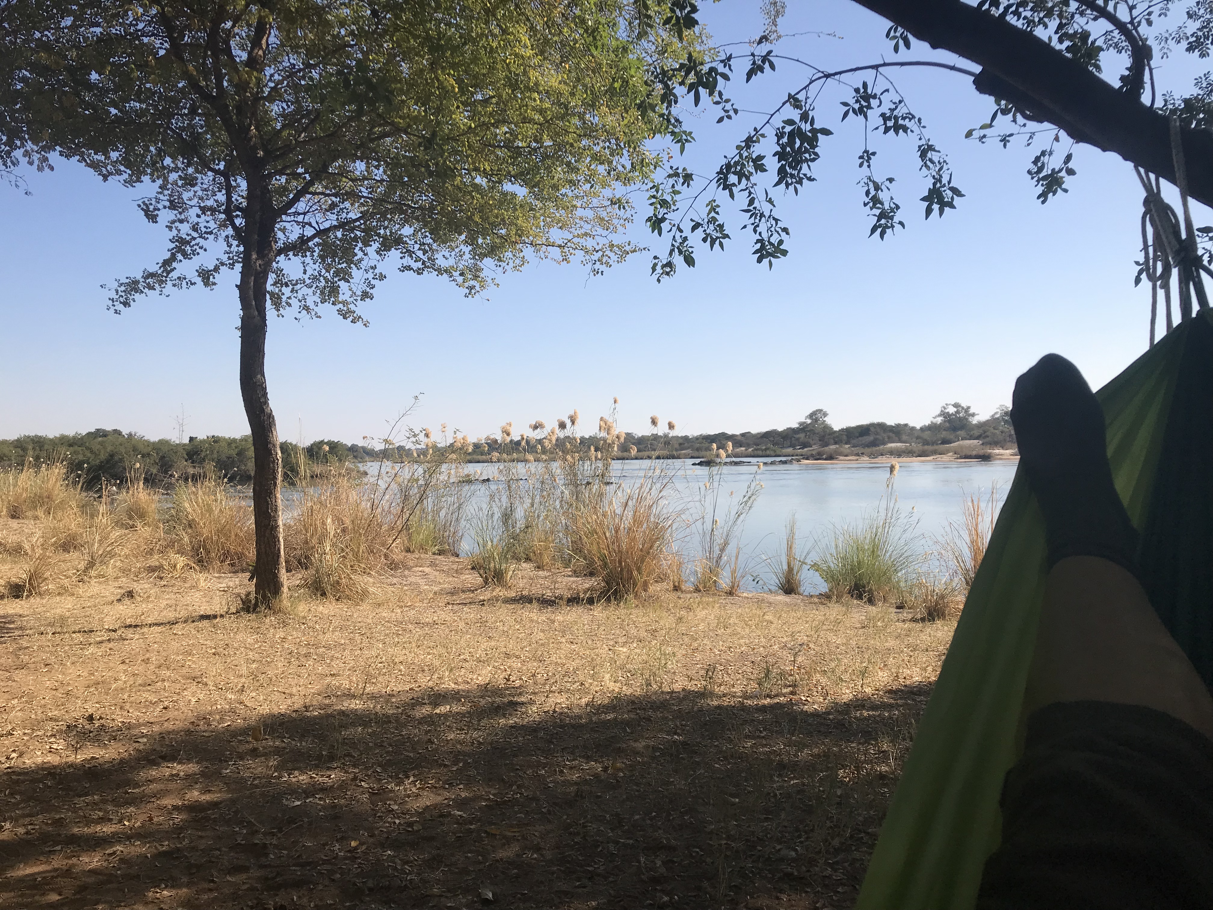 Unsere Campsite ist Nummer 7, direkt am Fluss gelegen, das hatte ich schon im Januar gebucht. Und alle freuen sich über die Lage, bis wir mitten im Fluss die Krokodile entdecken. Ich hatte auch in einem Reisebericht gelesen, dass Hippos nachts das grüne Gras auf der campsite knabbern würden, aber daran glauben wir nicht so richtig, denn sie sind nicht zu sehen.