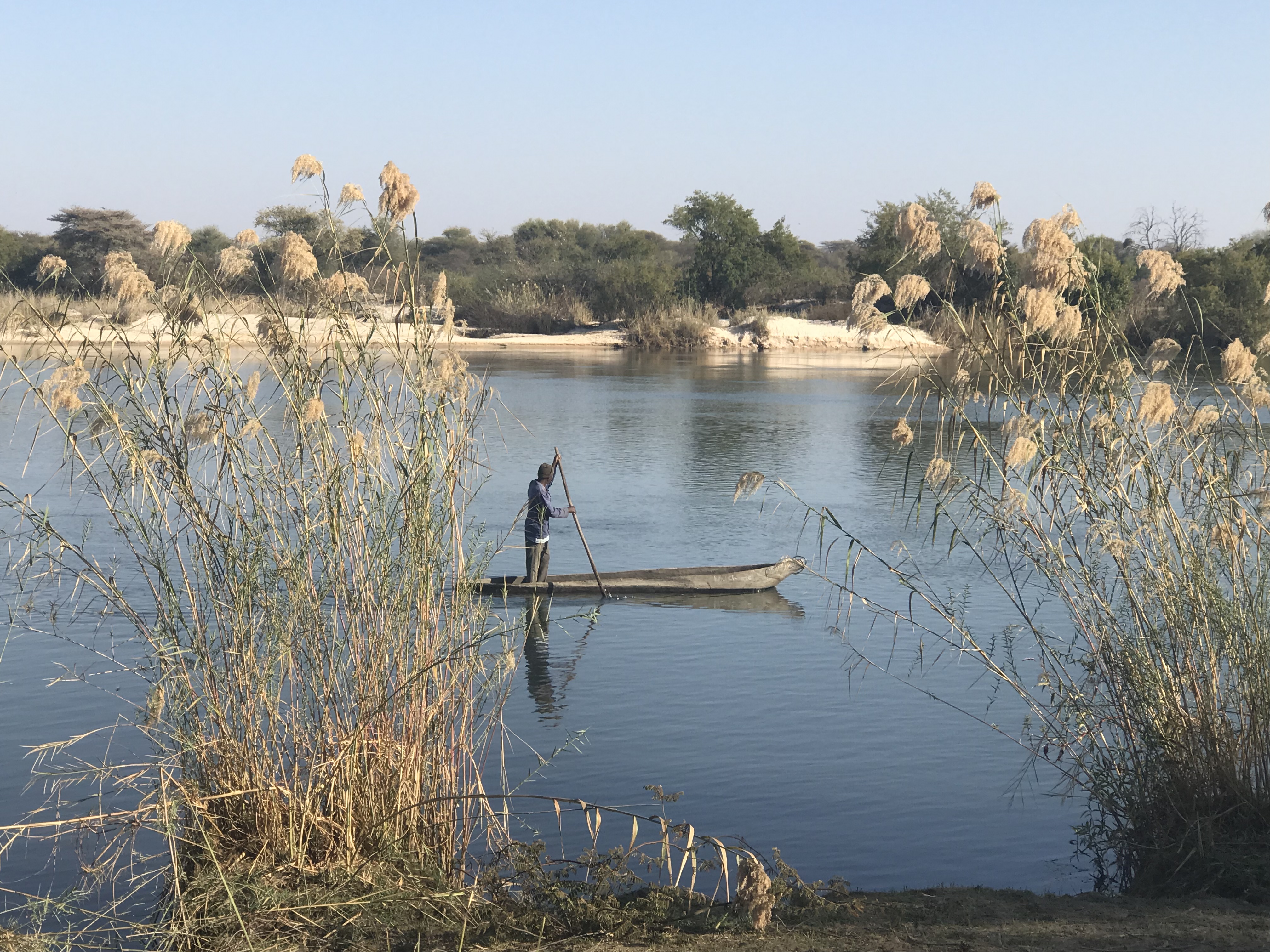 Egal, in Afrika ist man auch sehr flexibel. Nach 15 Minuten werden wir von einem Boot von der Nachbarlodge abgeholt und die Tour startet. Vorbei an unseren Krokodilen und an vier dicken Hippos, die an Land im Sand liegen. Wir sehen nur ihre Popos. Nach so viel unterschiedlichen Wüsten tut das Wasser richtig gut. Die Popa-Wasserfälle sind sehr klein und kein richtiger Wasserfall, trotzdem dürfen wir auf der Sandinsel aussteigen, um Fotos zu machen.
