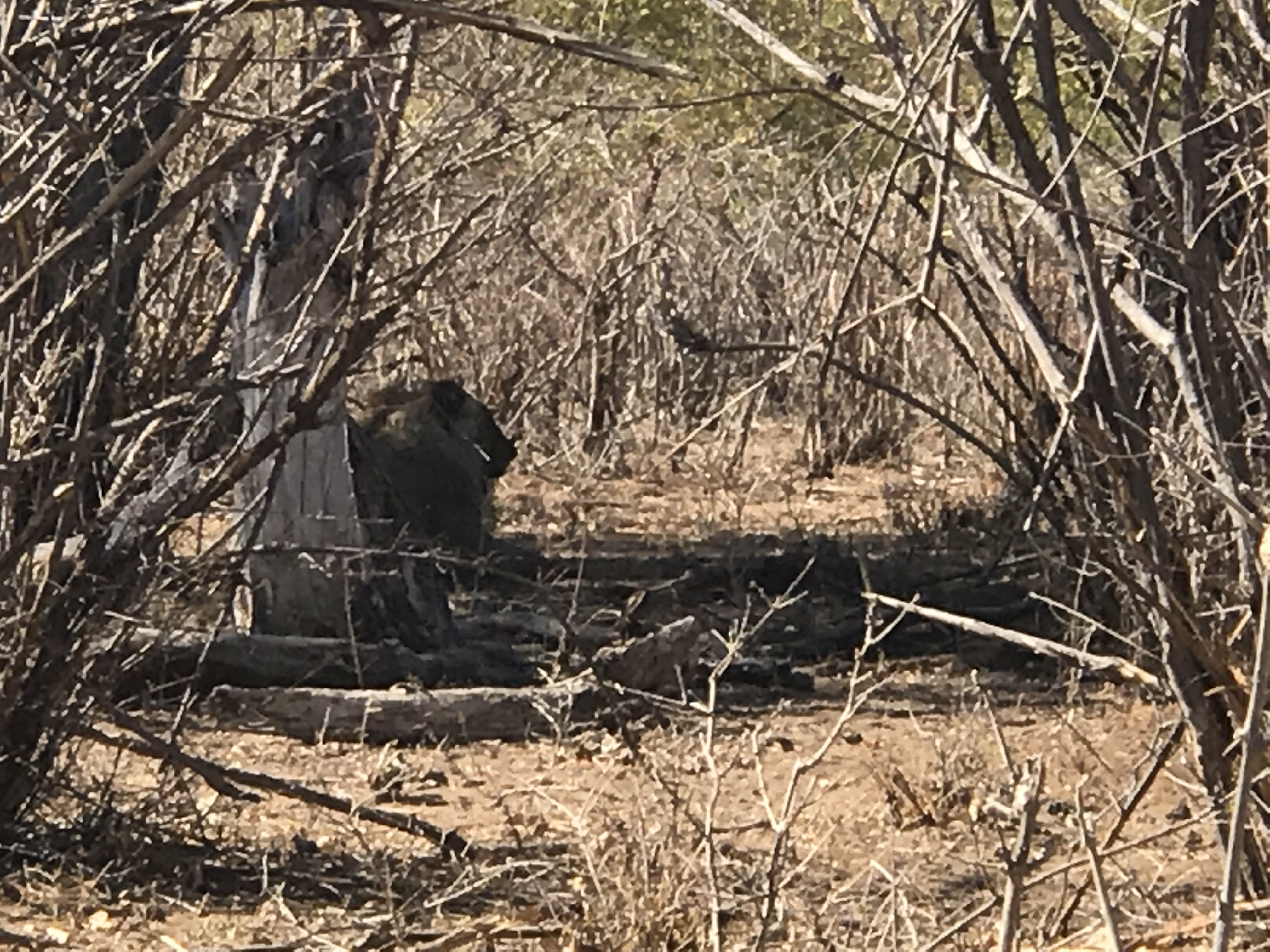 Nach 2 1/2 Stunden beschließen wir zurück zu fahren, nach einem kleinen Halt. Sprachen wir wieder über die Verstecke der Löwen und ich meinte mit einem Verweis auf die linke Autoseite, dass sich Löwen eher auf dieser Seite verstecken würden und sage, da ist einer. Wir können es kaum glauben, ganz in der Nähe von uns liegt ein Prachtexemplar (mein neues Lieblingswort) ein männlicher Löwe, ganz allein. Wir stellen das Auto ab, obwohl Frank jetzt unsere Bitten, langsam, noch ein bisschen vor oder langsam zurück, schon super gut befolgt. Wir sind ein super Team. Unsere Fotoapparate klicken. Der Löwe steht auf, dreht sich und gähnt. Es ist wunderbar zu beobachten. Nach 20-30 Minuten fahren wir beseelt weiter und denken, das war nun wirklich der Höhepunkt und erwarten nicht mehr viel. Aber ganz plötzlich sagt Matthea Elefant und das war wirklich untertriebenen. Wir standen mitten in einer Herde von Elefanten, vielleicht 10 Tiere oder mehr, das Dickicht lässt das nicht erkennen, was aber sehr schnell für uns klar wird, den Elefanten gefällt unsere Anwesenheit überhaupt nicht. Sie tröten und einer kommt auf uns zu. Schnell hat Frank den Rückwärtsgang eingeschaltet und fährt rückwärts. Uns sitzt der Schreck echt in den Knochen. Wir warten, sehen die Elefanten nur durch das Dickicht, aber sie bleiben aggressiv, so kommt es uns vor. Nach einer Weile sind sie weiter gezogen und wir fahren sehr langsam an der Stelle vorbei. Nach einem km sind wieder zwei große Elefanten direkt neben der Straße, neben unserem Auto, vorher nicht zu sehen, wieder ein lautes Tröten, mein Fenster war offen und ich sagte zu Frank, fahr weiter und er wurde wirklich schnell. Jetzt war uns wirklich klar, wir sind in der freien Natur und die Tiere sind Wildtiere.